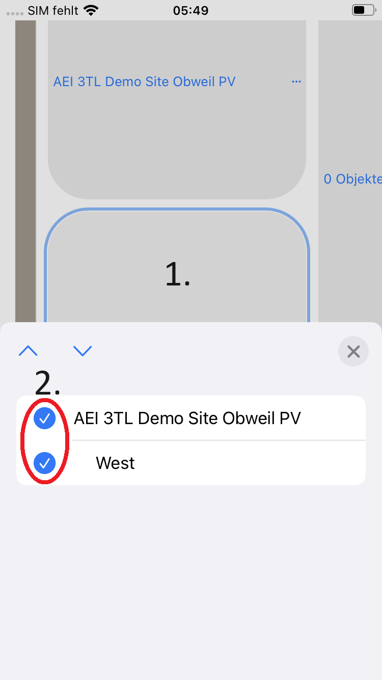 - 7. Berühren Sie den Text "0 Objekte" um die Anlagenauswahlliste zu sehen (nur relevant für Apple Geräte)